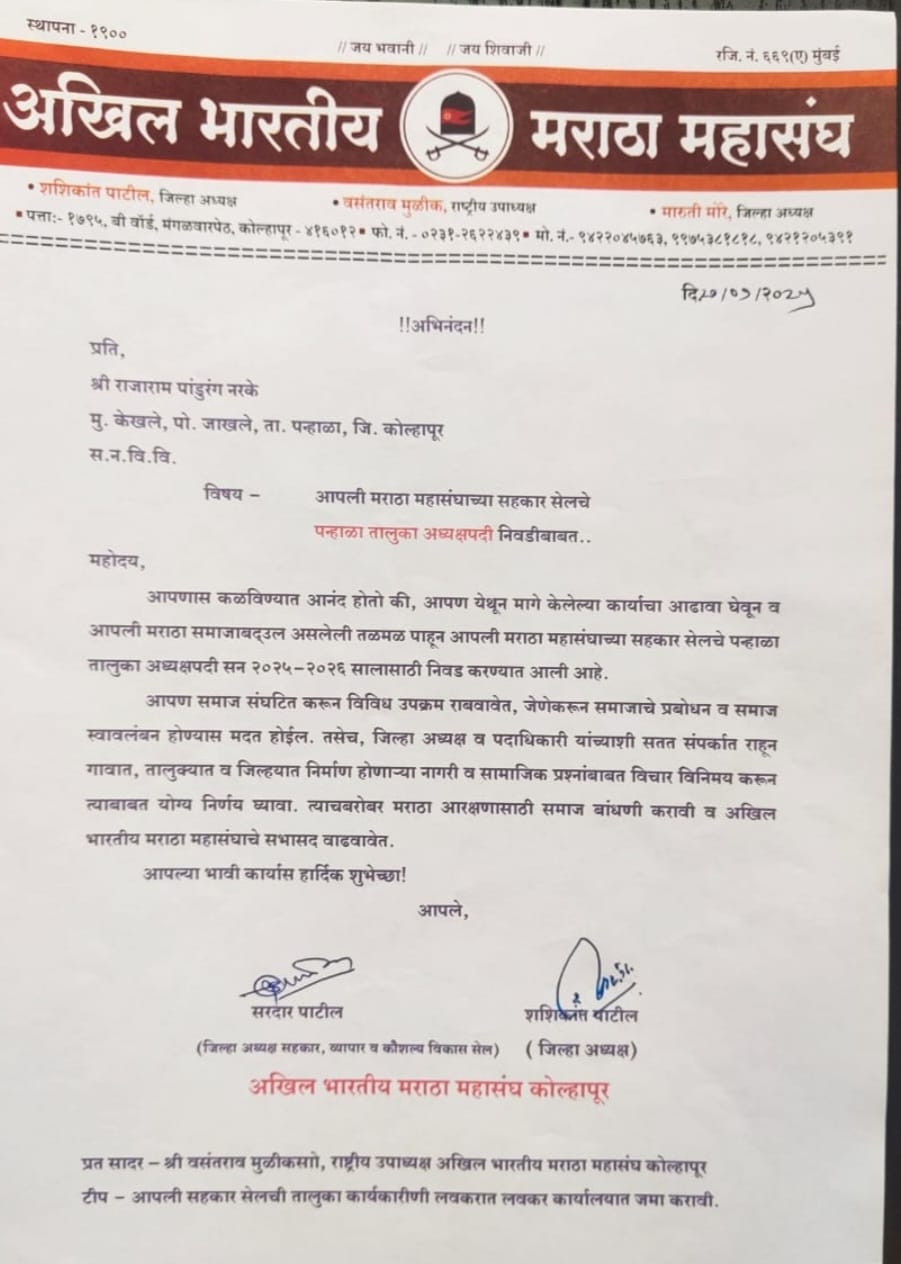 अखिल भारतीय मराठा महासंघ सहकार सेलच्या पन्हाळा तालुका अध्यक्षपदी राजाराम नरके यांची निवड