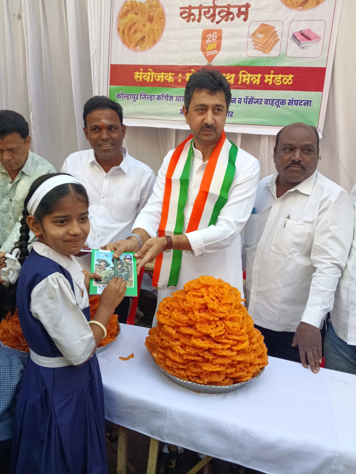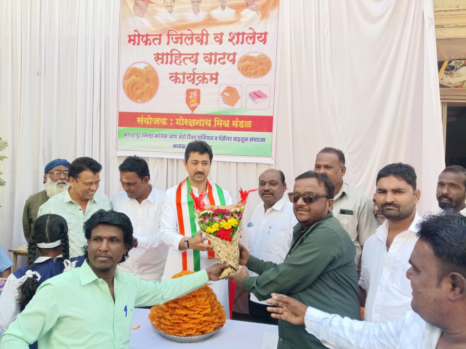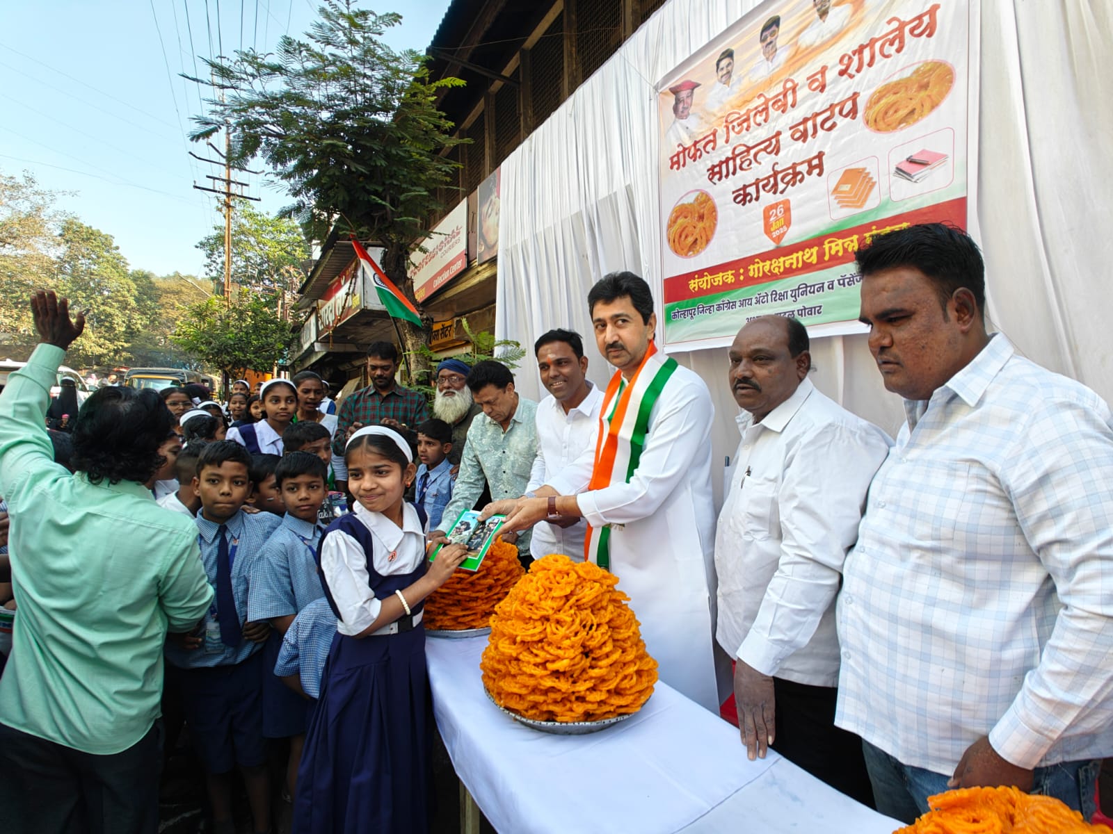कोल्हापूर: प्रजासत्ताक दिनाच्या निमित्ताने गोरक्षनाथ मित्र मंडळ, कोल्हापूर जिल्हा काँग्रेस आय ऑटो रिक्षा युनियन व पॅसेंजर वाहतूक संघटनेच्या वतीने मोफत जिलेबी व शालेय साहित्य वाटपाचा प्रशंसनीय उपक्रम राबवण्यात आला. या कार्यक्रमाचे उद्घाटन छत्रपती मालोजीराजे यांच्या शुभहस्ते करण्यात आले.