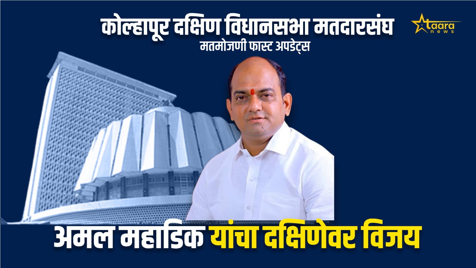 कोल्हापूर दक्षिण विधानसभा मतदारसंघात भाजपचे उमेदवार अमल महाडिक यांनी काँग्रेसचे उमेदवार ऋतुराज पाटील यांचा पराभव करत विजयी पताका फडकावली आहे. दुसऱ्या फेरीपासूनच आघाडी घेतलेल्या महाडिक यांनी तिसऱ्या फेरीपासून ही आघाडी अधिक मजबूत केली आणि शेवटच्या फेरीपर्यंत निर्विवाद वर्चस्व राखले.