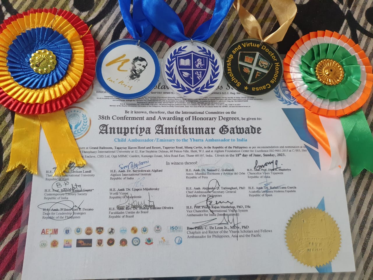 ती अनेक राष्ट्रीय व आंतरराष्ट्रीय स्तरावरील संस्थांची ब्रँड अँबेसिडर असून आजपर्यंत तिला राष्ट्रीय व आंतरराष्ट्रीय स्तरावरील 50 हून अधिक पारितोषिके व अनेक स्पर्धा परीक्षेत 90 हून अधिक मेडल्स प्राप्त झाले आहे. ती भारताची लिटिल सुपर स्पीकर असून वक्तृत्व, प्रश्नमंजुषा आणि क्रीडा स्पर्धेतही तिने उज्वल यश संपादित केले आहे सध्या ती संविधान व बालहक्क कायद्याचे जाणीव जागृतीचे कार्यक्रम हाती घेत असून 5000 हून अधिक नागरिकांना तिने संविधानाचा जागर केला आहे.