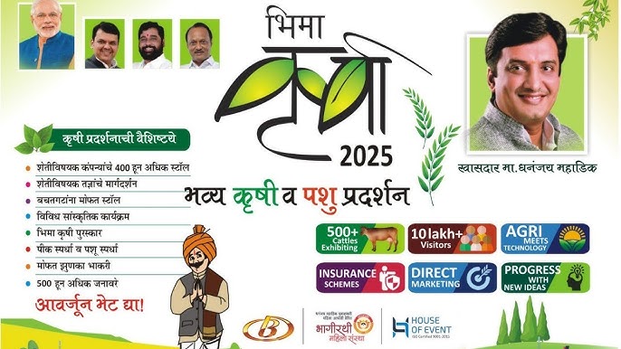 पश्चिम महाराष्ट्रातील सर्वात मोठ्या भीमा कृषी व पशु प्रदर्शनाला शुक्रवारपासून दिमाखात सुरुवात झाली आहे. खासदार धनंजय महाडिक यांच्या संकल्पनेतून साकारलेल्या या कृषी प्रदर्शनाचे उद्घाटन कृषिमंत्री माणिकराव कोकाटे यांच्या हस्ते फित कापून झालं. यावेळी माजी.आमदार महादेवराव महाडिक, खा. धनंजय महाडिक,खासदार धैर्यशील माने ,माजी आमदार सुरेश हळवणकर, जिल्हाधिकारी अमोल येडगे, जिल्हा परिषद सीईओ एस कार्तिकेयन, यांच्यासह विविध क्षेत्रातील मान्यवर उपस्थित होते.
