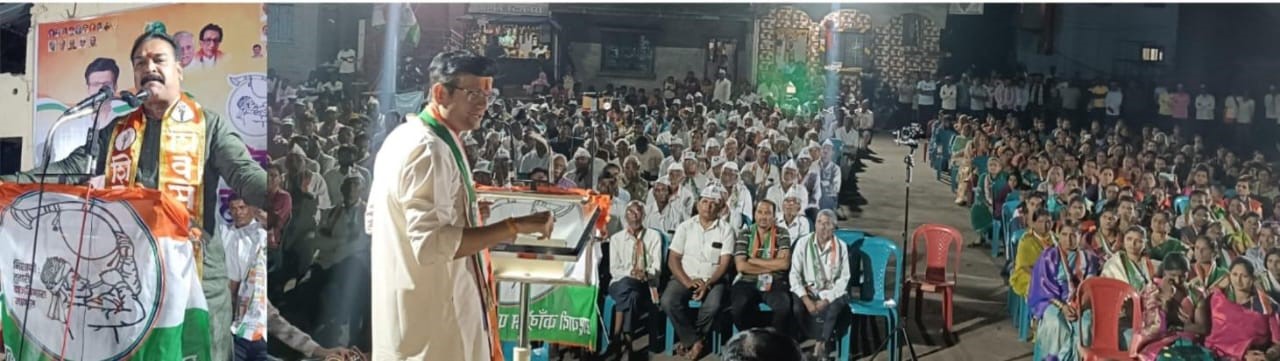 छायाचित्र बामणी येथे प्रचार सभेत बोलताना शिवसेना उबाठाचे संजय पवार,समरजितसिंह घाटगे,समोर मोठ्या संख्येने उपस्थित जनसमुदाय शक्तिपीठ महामार्ग रद्द झाल्याचा खोटा जीआर दाखवून पालकमंत्र्यांनी शेतकऱ्यांना फसविले-समरजितसिंह घाटगे*