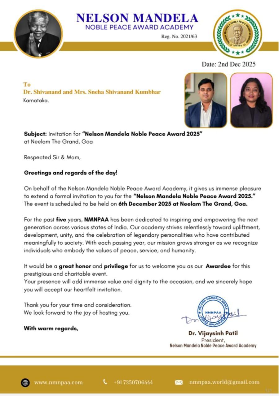 नेल्सन मंडेला नोबेल पीस अवॉर्ड 2025 : भारतीय आयुर्वेदाच्या तेजाला जागतिक मंचावर निपाणीचा मानाचा मुजरा