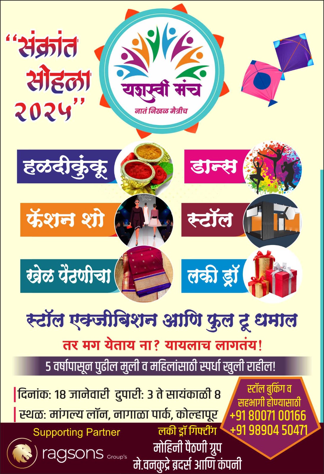 कोल्हापूर, ताराबाई पार्क येथील मांगल्य लॉनमध्ये 18 जानेवारी रोजी दुपारी 3 ते सायंकाळी 8 या वेळेत यशस्वी मंचतर्फे "संक्रांत सोहळा 2025" चे आयोजन करण्यात आले आहे. या सोहळ्यात महिलांसाठी आणि मुलांसाठी विविध मनोरंजक स्पर्धांचे आयोजन करण्यात आले असून, हळदीकुंकू कार्यक्रमासह फॅशन शो, डान्स स्पर्धा, स्टॉल्स, आणि लकी ड्रॉ यांचा आनंद सहभागी होणाऱ्यांना लुटता येणार आहे.