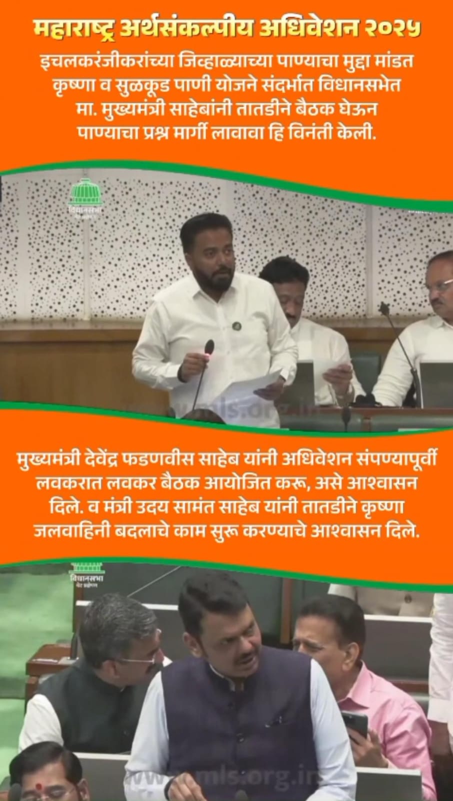 महाराष्ट्र विधिमंडळाच्या चालू अधिवेशनात इचलकरंजीचे आमदार डॉ. राहुल प्रकाश आवाडे यांनी इचलकरंजी शहराच्या पाणीपुरवठ्याचा गंभीर प्रश्न विधिमंडळात उपस्थित करत सरकारचे लक्ष वेधले. शहरातील कृष्णा पाईपलाइन योजना अद्याप अपूर्ण असून, कंत्राटदाराच्या हलगर्जीपणामुळे नागरिकांना पाण्यासाठी तडफडावे लागत आहे, असा मुद्दा त्यांनी सभागृहात जोरदार मांडला.महत्त्वाचे मुद्दे मांडताना, आमदार राहुल आवाडे यांनी सांगितले की, "कृष्णा पाईपलाइन योजनेचे काम अनेक महिन्यांपासून रखडले असून, या कामात दिरंगाई करणाऱ्या कंत्राटदाराला त्वरित काळ्या यादीत टाकण्यात यावे." तसेच, 2022 मध्ये मंजूर झालेली सुळकुड पाणीपुरवठा योजना अद्याप राजकीय कारणांमुळे रखडली आहे, याकडेही त्यांनी मुख्यमंत्र्यांचे लक्ष वेधले.