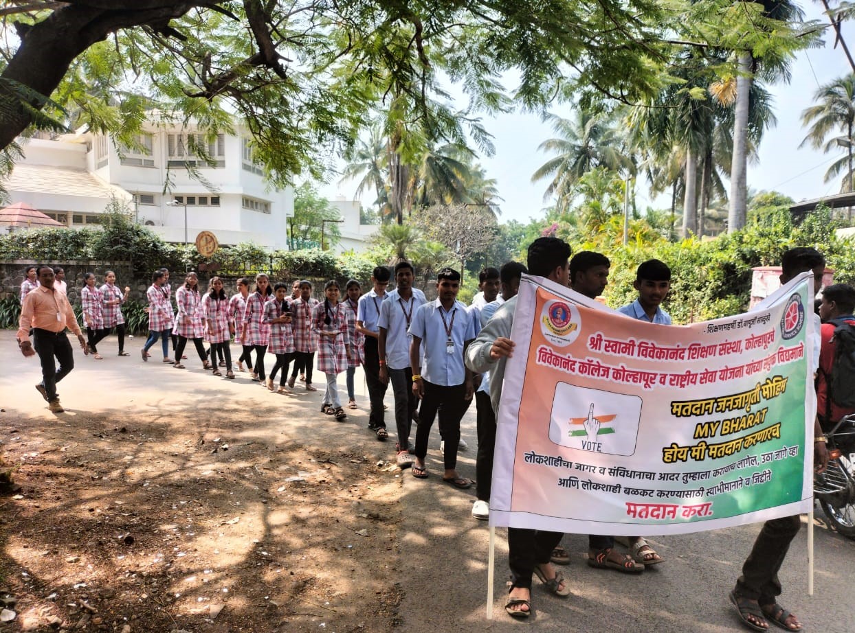 शनिवार दि.16.11.2024 रोजी समाजातील मतदारांमध्ये 'माझे मत, माझा अधिकार'या गोष्टीची जाणीव करून देण्यासाठी व मतदानाचे पवित्र कर्तव्यबजाविण्यासाठी विवेकानंद कॉलेज पासून नागळा पार्क, ताराबाई पार्क, जिल्हा परिषद मार्गे विवेकानंद कॉलेज या भागात मतदान जनजागृती मोहिमेचे रॅलीच्या माध्यमातून आयोजन करण्यात आले. कॉलेजचे प्राचार्य डॉ.आर. आर. कुंभार यांचे हस्ते मतदान जनजागृती मोहिमेचे उद्घाटन करण्यात आले. विवेकानंद कॉलेज कोल्हापूर व राष्ट्रीय सेवा योजना यांच्या संयुक्त विद्यमाने सदर कार्यक्रमाचे आयोजन करण्यात आले. आपल्या मताचे महत्त्व पटवून देण्यासाठी विद्यार्थ्यांनी वेगवेगळ्या घोषणांच्या ब्रीद वाक्यांच्या माध्यमातून समाजामध्ये मतदान करणे आपले पवित्र कर्तव्य कसे आहे ? हे पटवून दिले.