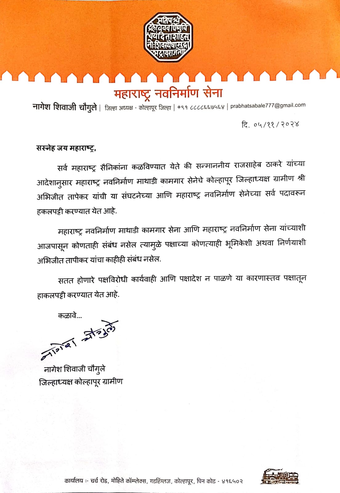 कोल्हापूर: महाराष्ट्र नवनिर्माण सेनेच्या अध्यक्ष श्री. राज ठाकरे यांच्या आदेशानुसार, महाराष्ट्र नवनिर्माण माथाडी कामगार सेनेचे कोल्हापूर जिल्हाध्यक्ष अभिजीत तापेकर यांना महाराष्ट्र नवनिर्माण सेना आणि महाराष्ट्र नवनिर्माण माथाडी कामगार सेनेच्या सर्व पदांवरून हकालपट्टी करण्यात आली आहे.
